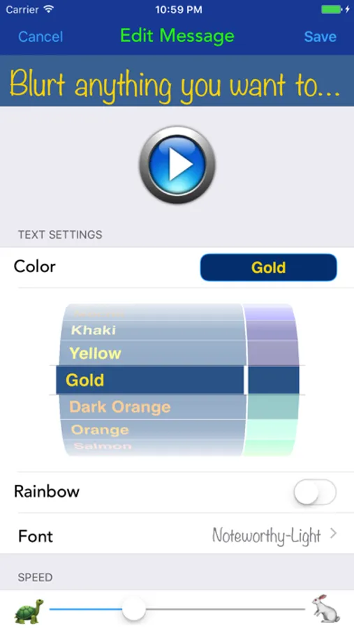 Blurt has been designed for maximum readability, with ultra-smooth scrolling, for display in either portrait, landscape, or free rotation mode in over 40 different colors. Create a library of messages to use instantly, or display all of your messages as one long playlist.