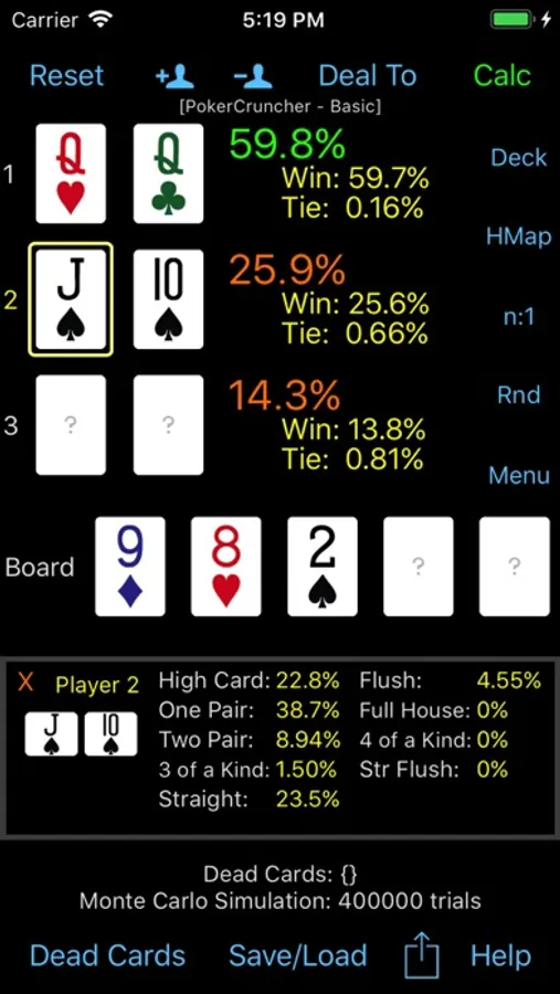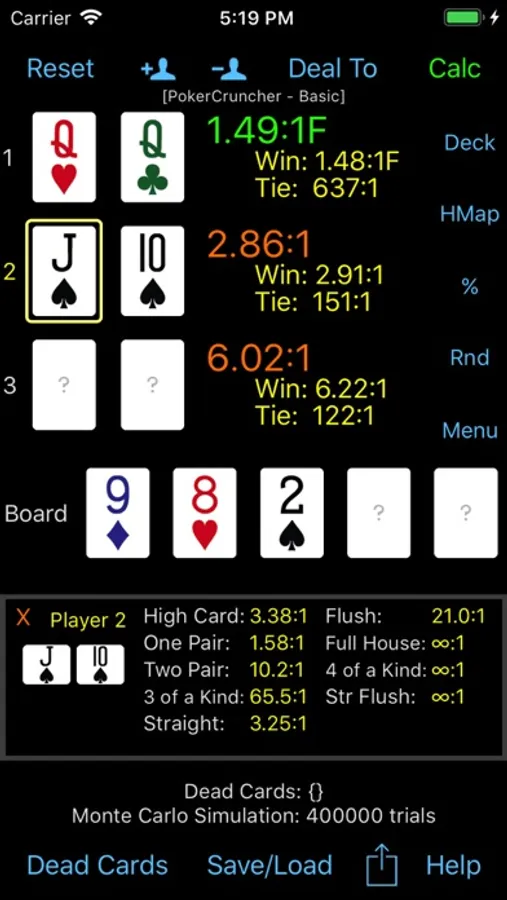 PokerCruncher-Basic supports up to 10 players and specific cards and random/unknown cards. Even though this is the Basic version of PokerCruncher, it has additional features like hand type stats, dead cards, and n:1 odds that some other odds/equity calculators don’t have.