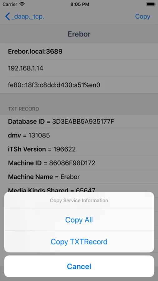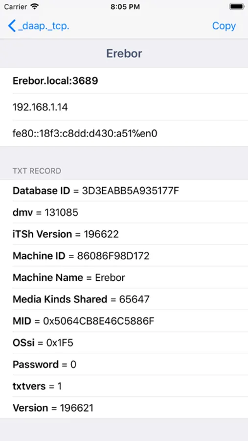 • Displays information about each service, including domain name, IP address(es), and TXT record