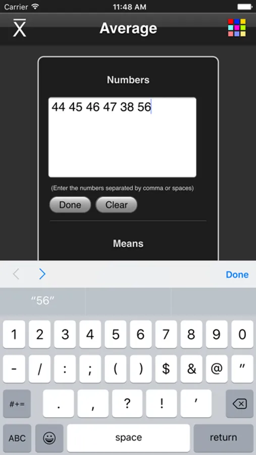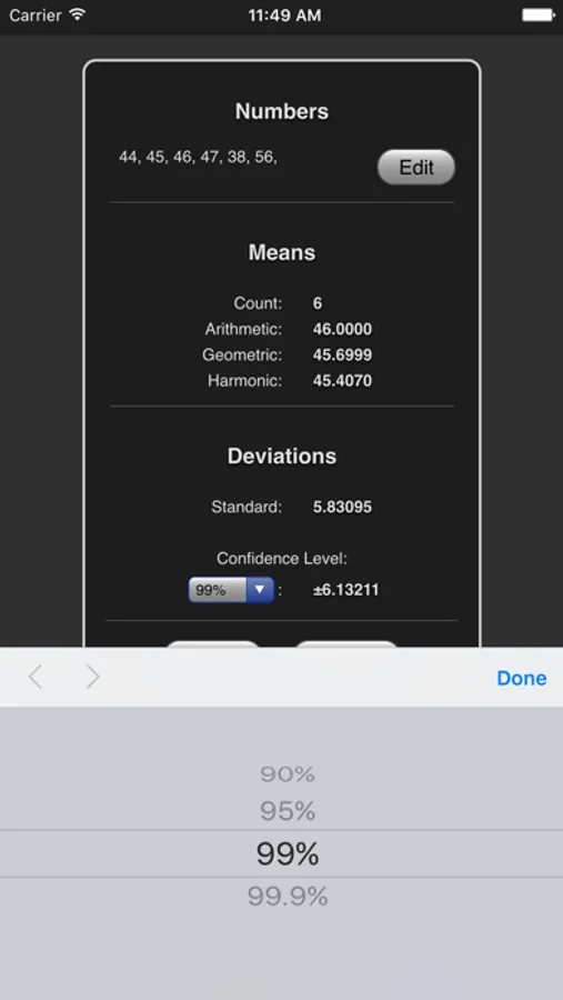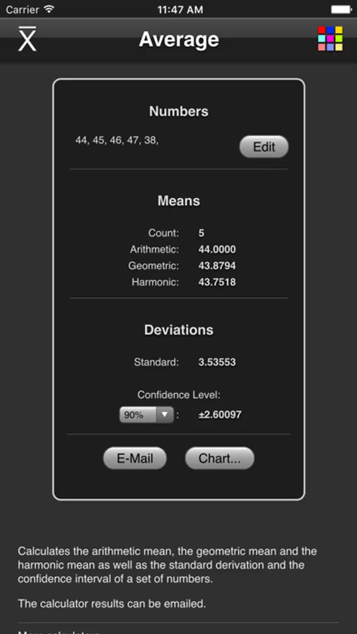 Calculates the arithmetic mean, the geometric mean and the harmonic mean as well as the standard deviation and the confidence interval of a set of numbers.