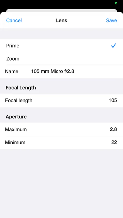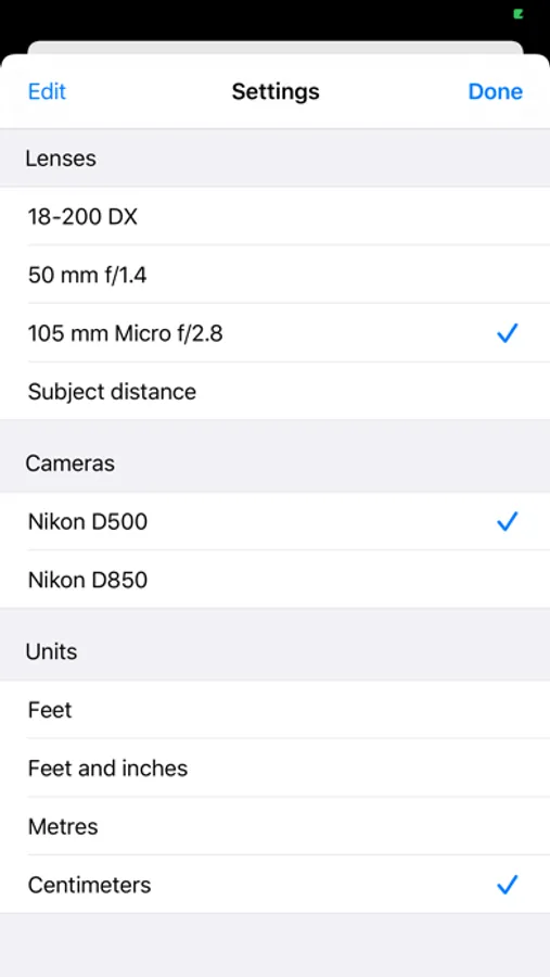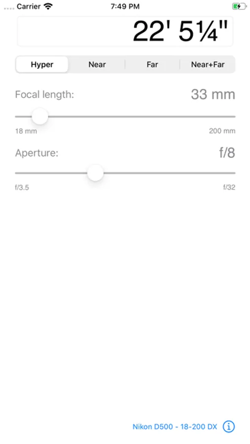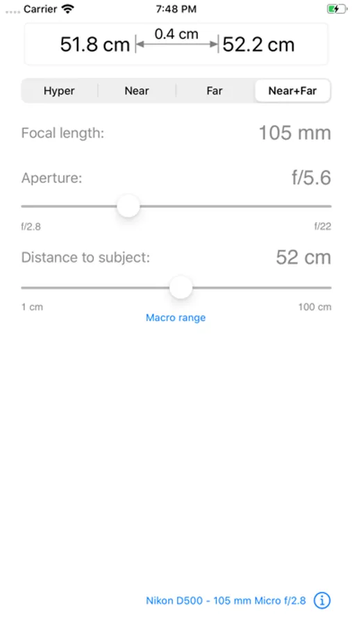 - Switch distance type - hyperfocal, near limit, far limit and combined near/far limits - with a single touch