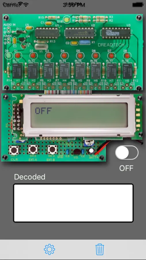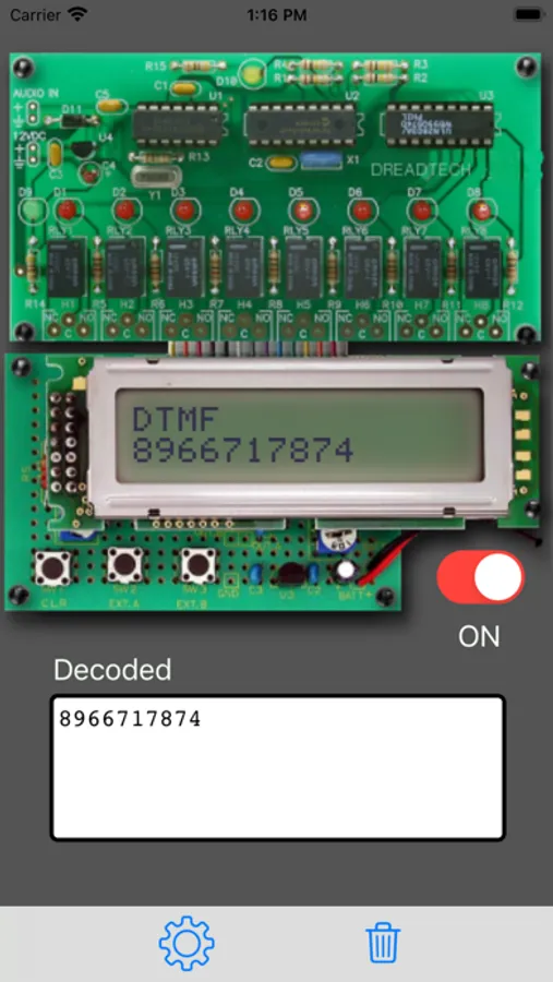 Turns your iPhone into a simple DTMF decoder. Simply hold the iPhone's microphone near to a clear source of DTMF tones (telephone "Touch Tones") and it will display the numbers being dialed. The decoded digits are also placed into a text area from which you can copy them to the clipboard.