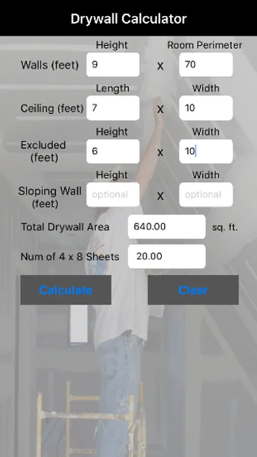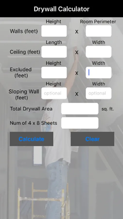 After you input any dimensions you have, total square footage is figured and displayed, along with the number of 4' x 8' (8' is the default, you can change to any length)drywall sheets you will need.