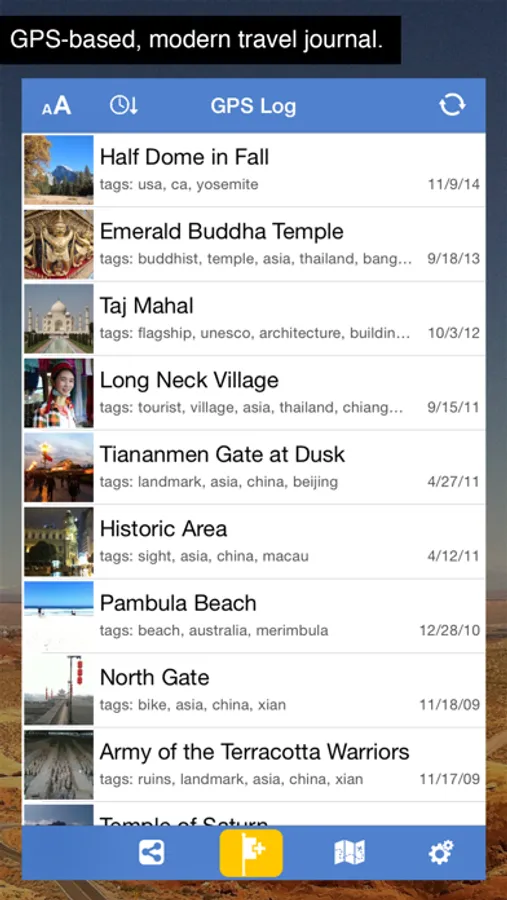 GPS Log is a location-first way to record your adventures. Whether you're backpacking overseas, or exploring your local neighborhood, GPS Log gives you everything you need to capture your travels, share your favorite places with your friends, and find your way back again!