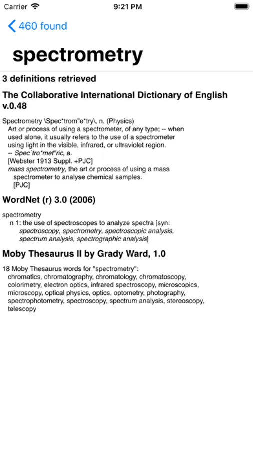 The basic word search features can be used without an internet connection. If you have an internet connection, Megawords can also look up word definitions for the search results in online dictionaries. Thesaurus results will also be shown if found.