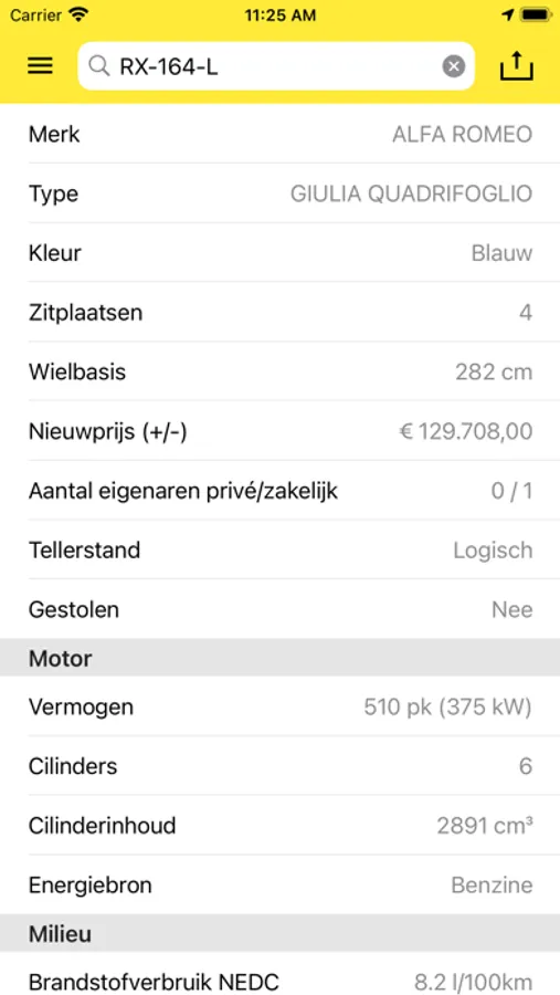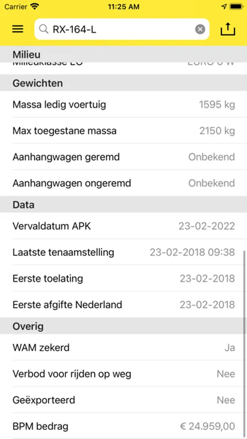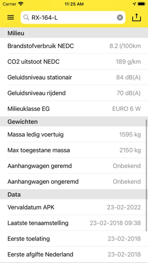 De gegevens die je onder andere te zien krijgt: Merk, Type, Kleur, Zitplaatsen, Aantal eigenaren, Logische tellerstand, Nieuwprijs, Gestolen, Cilinders, Cilinderinhoud, Vermogen in pk en kW, Brandstof, , Brandstofverbruik WLTP en NEDC, Actieradius , CO2 uitstoot, Geluidsniveau, Milieuklasse, Massa ledig voertuig, Maximaal toegestane massa, Maximaal te trekken massa ongeremd en geremd, APK gegevens over; de Vervaldatum, Laatste tenaamstelling, Eerste toelating, Eerste afgifte Nederland, Wacht op keuren, WAM verzekerd, Geëxporteerd en de BPM.