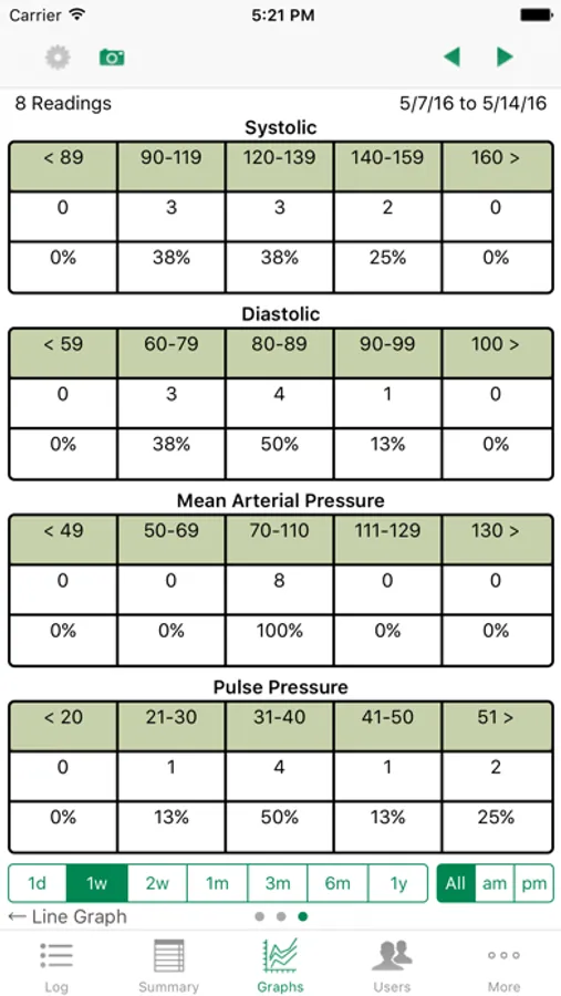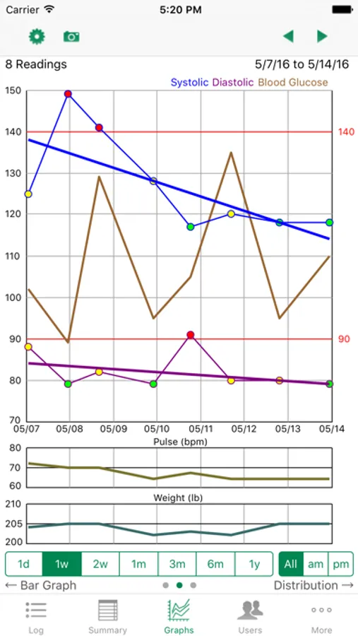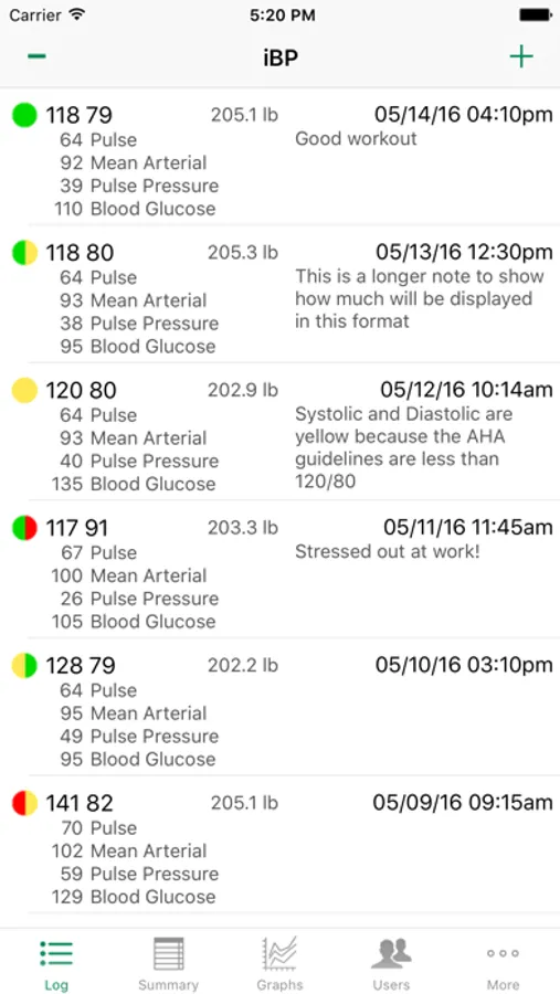 iBP uses color icons to indicate when your blood pressure values are normal, high, or hypertension. It also provides interactive graphs that allow you to display your values by weeks, months, year and time of day. The graphs display lows, highs, averages, and trend lines using statistical analysis.