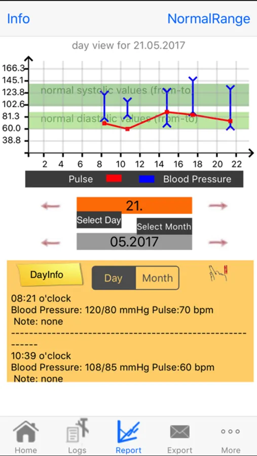 - keep detailed records using specific criteria to generate daily and monthly graphs like those commonly used in the medical field: in addition to graphically displaying a selected day’s values, a monthly view is also available: as well as viewing a chart of your minimum, maximum and average blood pressure and pulse values for a selected month