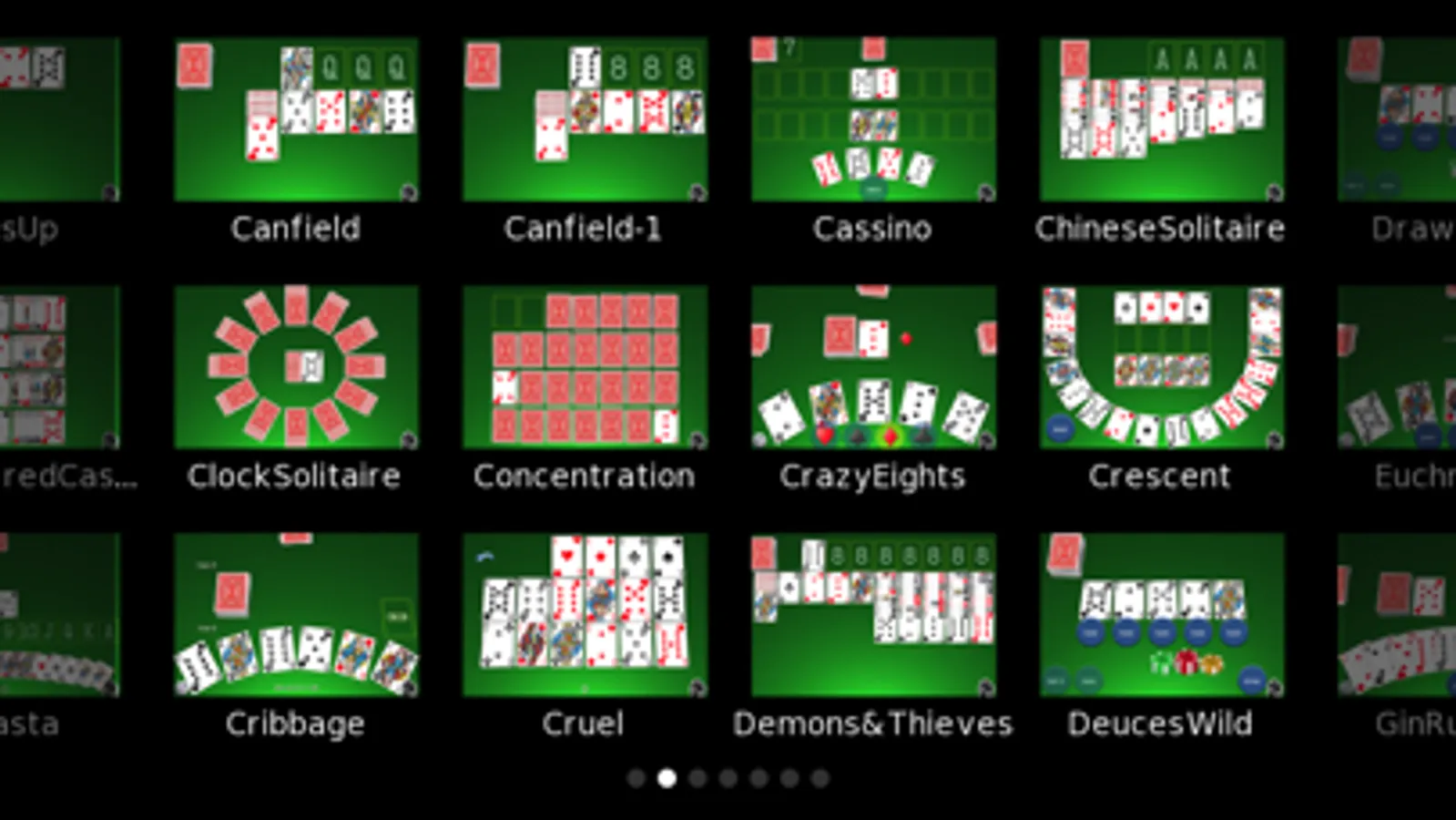 Supported games include: Klondike (Classic Solitaire), FreeCell, Cassino, Canfield, Basic Rummy, Gin Rummy, Rummy 500, Spider Solitaire, Cruel Solitaire, Beleaguered Castle, Spiderette, Bristol Solitaire, Hearts, Memory Match (Concentration), Speed Match, Calculation, Forty Thieves, Euchre (US), Deuces Wild and Jacks or Better Draw Poker, Aces Up, Spades (non-partnership variant), Limit Texas Hold 'Em, Speed, Batsford Solitaire, Josephine, Red & Black, Sea Towers, Crazy Eights, Tripeaks, Golf, Eagle Wing, Pyramid, Old Maid, War, Go Fish, 13 Packs (aka Grandma's Game), Royal Cotillion, Blackjack (21), Royal Parade, Thieves of Egypt, Scorpion, Pile On, Montana, Canfield, Clock Solitaire, Kings Corner, Russian Cell, Yukon, I Doubt It, Four Seasons, Crescent, Osmosis (aka Treasure Trove), Canasta, La Belle Lucie, Australian Solitaire, Egyptian Ratscrew, SheepsHead(new), Kings in the Corner, Eight Off, Queenie (new), Samara (new)
