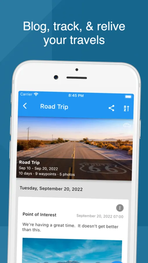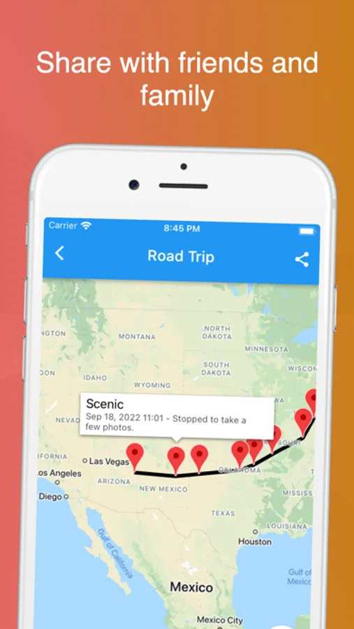 The app creates an interactive map of your waypoints, which you can share with your family and friends. They can follow along with the app or with a web browser on any device.