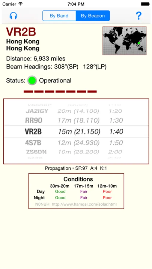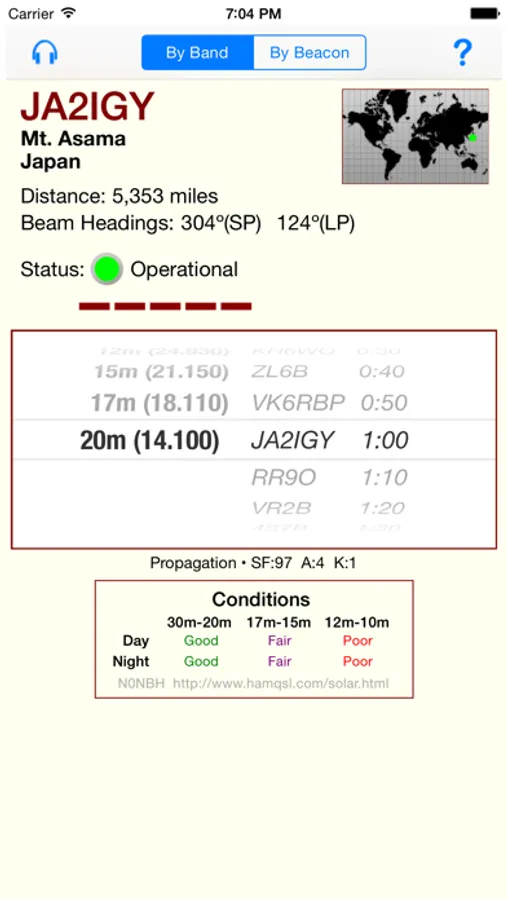 Use BeaconAid-HF -- while listening to your receiver -- to decipher the global NCDXF/IARU HF beacon network and determine actual, real-time band openings. Even if you don't understand Morse code identifiers of the 18 beacon stations, with the help of your receiver, BeaconAid-HF will show you where in the world the 20, 17, 15, 12, or 10 meter bands are really -- not theoretically -- open within three minutes. Or, use the "By Beacon" view while listening to your receiver to find out if one or more bands are open to a desired DX destination.