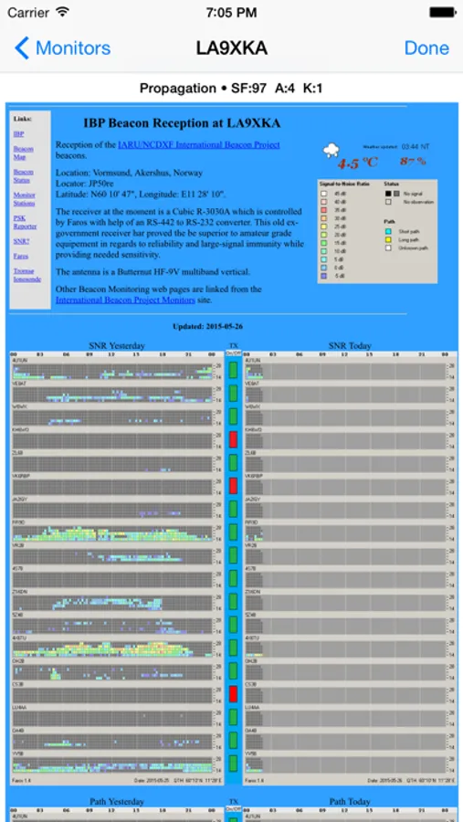 Current solar-terrestrial conditions (solar flux, A-index, and K-index) are retrieved from NOAA and displayed on several screens. Additional propagation conditions for the beacon bands are displayed on the main screens.