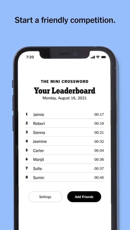 Start a friendly competition with The Mini leaderboards. Add up to 25 friends to see who can solve today’s Mini puzzle the fastest.