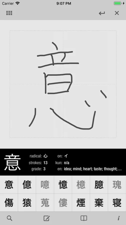 wishoTouch comes with its own full-screen kanji handwriting pad. You need to know the stroke order, but results are sorted in such a way that most of the time you don't need to draw the whole character. You can also find kanji by radical, number of strokes, meaning etc., rotate the device to quickly thumb through related characters, and watch interactive stroke-order animations for 6,355 kanji.
