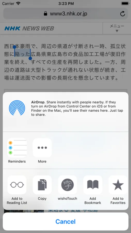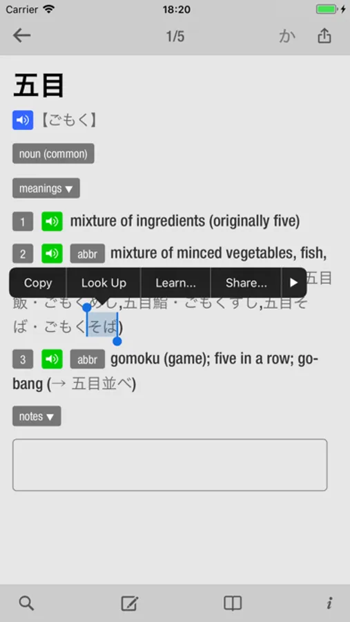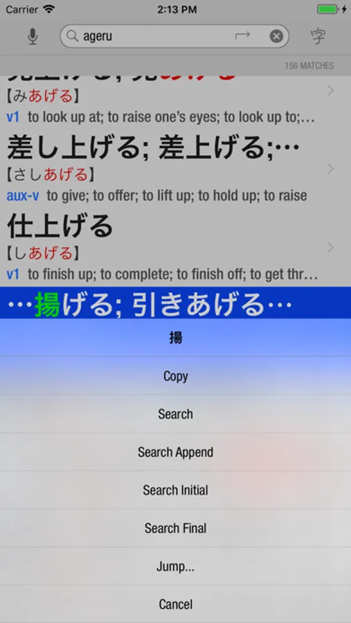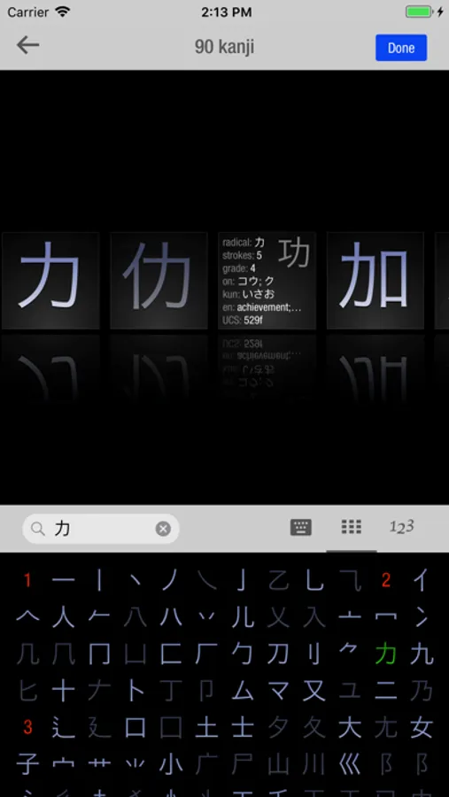 And that's not all. Tight integration with a word dictionary lets you seamlessly jump between a kanji and its compounds. This integration makes use of multitouch gestures: touching a kanji shows its details, while touch-holding gives you other options.