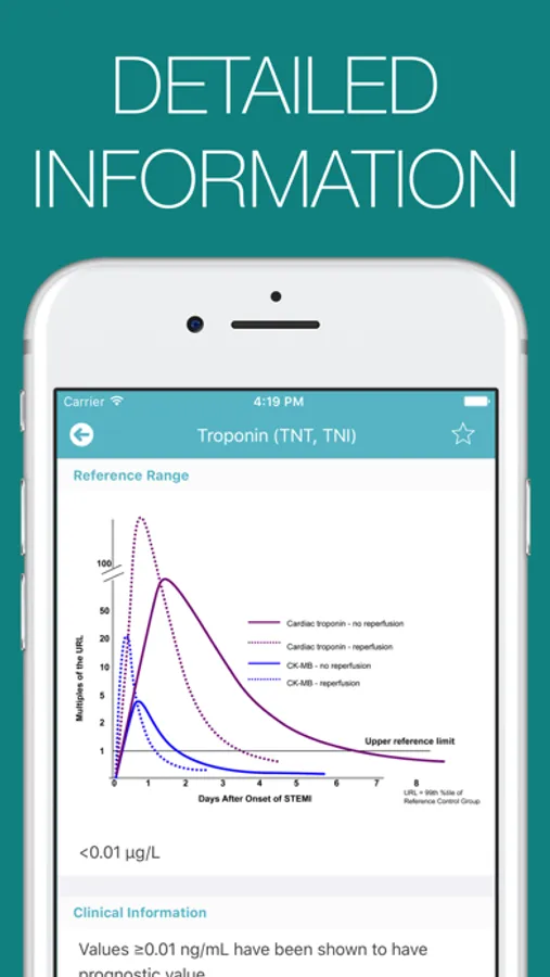 Once you open a lab value to read more about, you get to read a brief description along with reference range, clinical information and interpretation.