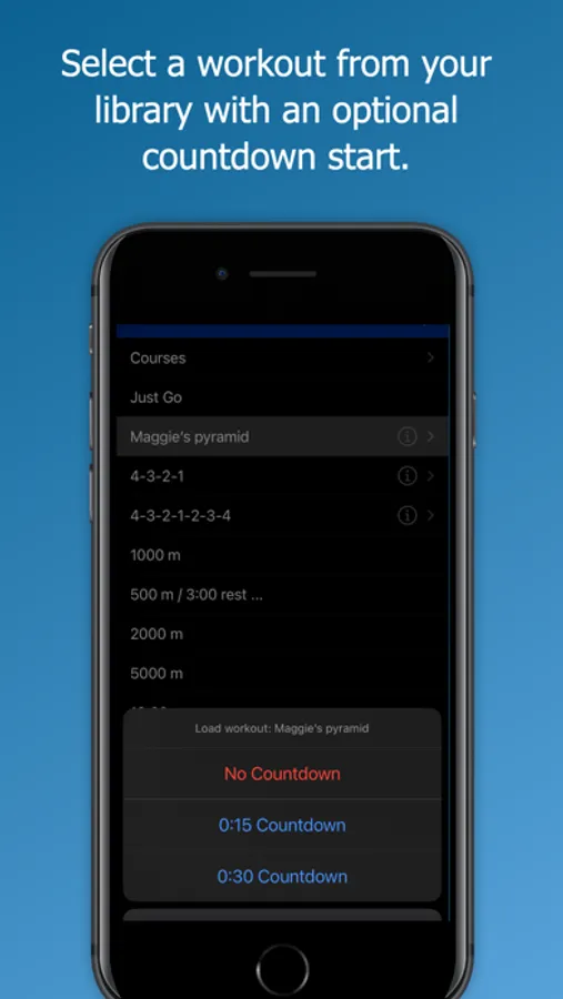 Select from one of the provided workouts, or create your own based on distance, time or strokes. An auto-start feature starts the timer when the first stroke is taken, or you can set a “countdown” of 15 or 30 seconds before the timer starts to allow you to build up speed before starting a piece.