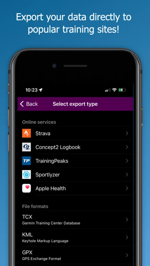 All workout data is recorded and can be reviewed on the device or uploaded directly to Strava, Concept2, TrainingPeaks, Sportlyzer, or the Apple Health app. On the history page for your practice, press "Select export type" to choose one of these options.