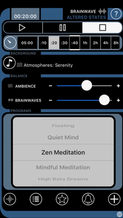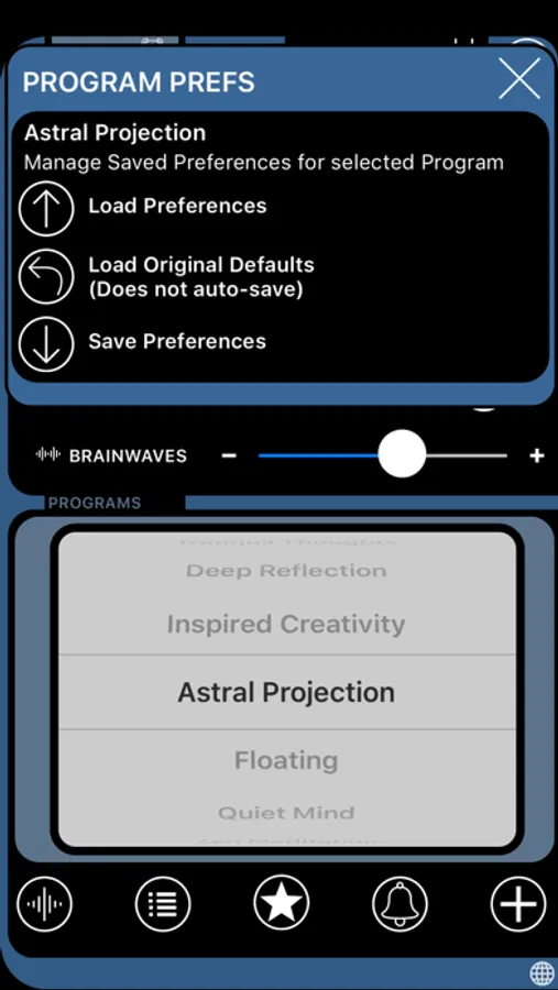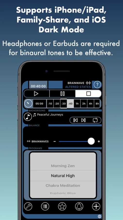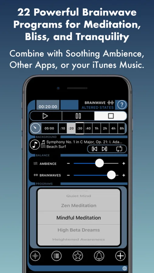 Combine Mind Altering Binaural Sequences with Soothing Nature Sounds, Ambient Music, your own iTunes Music (with the built-in iTunes playlist creator), or Audio from apps like Spotify and Audio Book Readers. * Powerful Binaural Programs for Lucid Dreaming, Mindful Meditation, Dreamy Sleep, Astral Projection, Zen Meditation and much more! * Universal app with built-in UIs for iPad, iPhone/iPod Touch, iPhone 5/6/6+ * Different states of mind are associated with specific brainwave frequencies that would inaudible if played directly, but can be induced by playing two different audible binaural tones into each ear, which, after being processed by the brain, are perceived as an inaudible low frequency beat matching the target brainwave frequency. As you listen your brainwaves fall into step with this inaudible beat, and after several minutes synchronize with the target frequency.