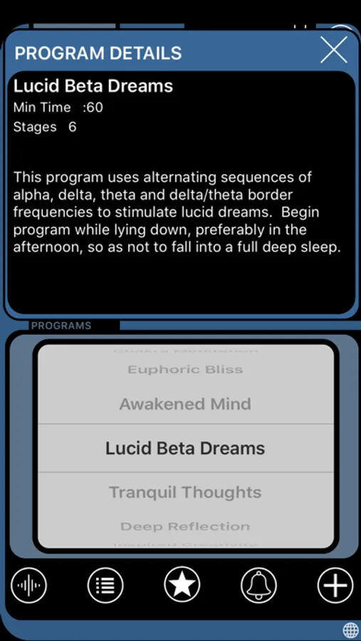 - Lucid Beta Dreams: This program combines elements of meditative and dreaming frequencies to create a state where you can experience waking dreams and truly escape. Lucid dreaming is a very unique state of consciousness where you will find yourself slipping in out of dreams while remaining aware of them.