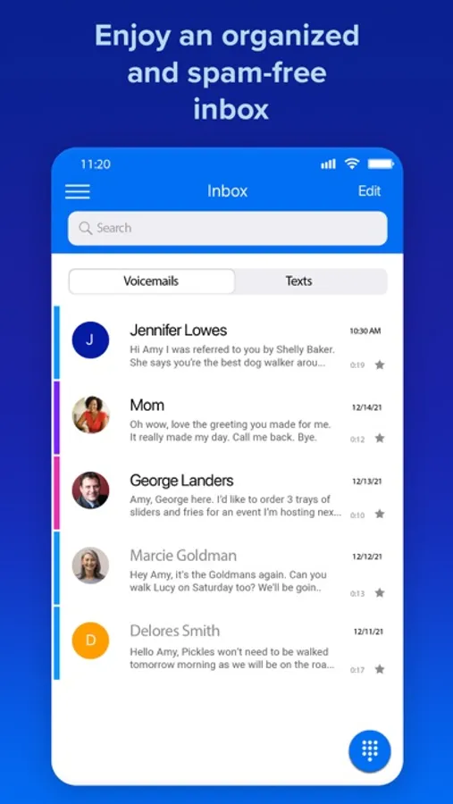 • In-app voicemail (optional) with “smart greetings” for added safety