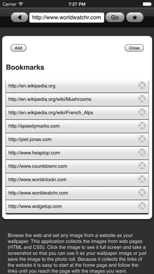 Browse the web and set any image from a website as your wallpaper. This application collects the images from web pages (HTML and CSS). Click the image to see it full screen and take a screenshot so that you can use it as your wallpaper image or just save the image to the photo roll.