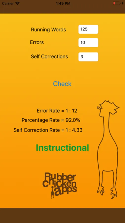 Running Recs is an easy way for teachers to check the results for a running record test of reading. Simply enter the number of words read, number of errors and the number of self corrections.