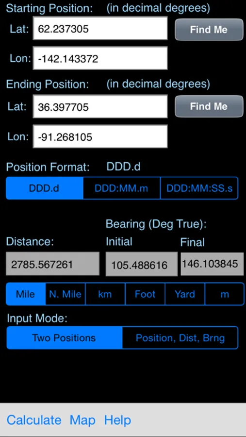 A coordinate utility app that calculates the distance and initial/final bearings between two points on Earth specified either manually by latitude and longitude or automatically using the built-in map. It can also calculate a final position given an initial position, distance, and bearing.