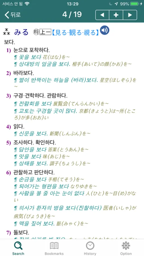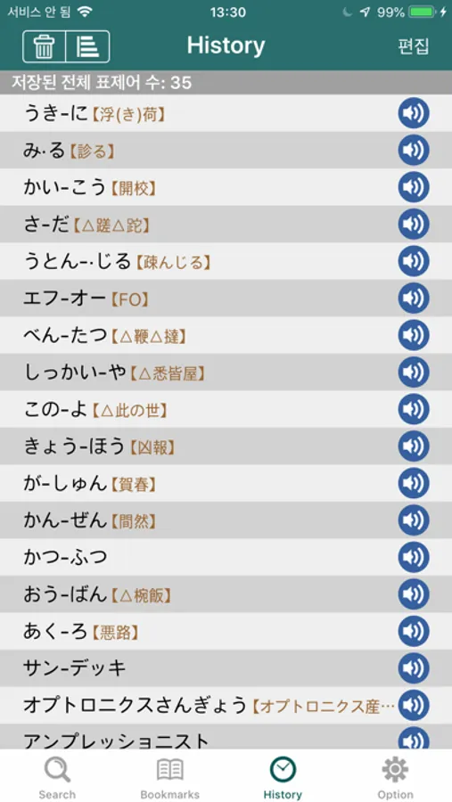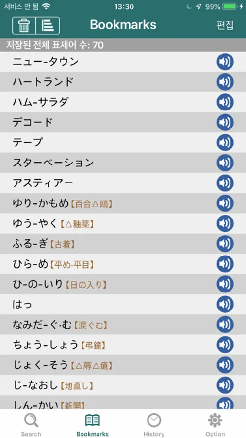 3. 사전 전체의 표제어들 중에 무작위로 5개~500개까지 추출(검색화면에서 단말기 흔들기)