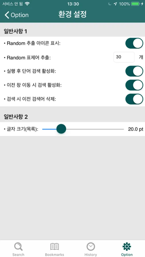 7. 검색(추출)된 표제어 목록과 책갈피 목록의 서체 크기를 Option 항목에서 변경 가능