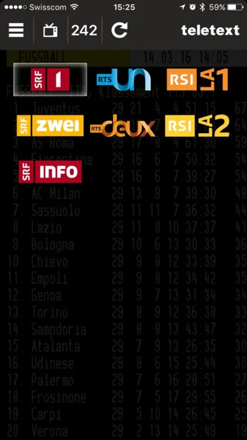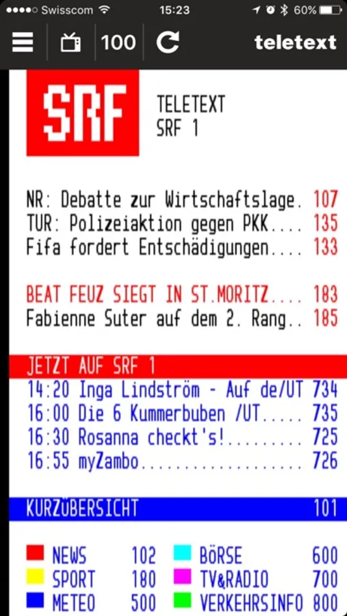 Die Navigation erfolgt über die bekannten Seitenzahlen oder per Rubrikenverzeichnis; so sind z.B. die wichtigsten News auf Seite 100, die Eishockey-Resultate auf Seite 301 usw. zu finden. Aktuell sind die TELETEXT-Angebote von SRF 1, SRF zwei, SRF info, RTS Un, RTS Deux, RSI LA 1 und RSI LA 2 verfügbar.