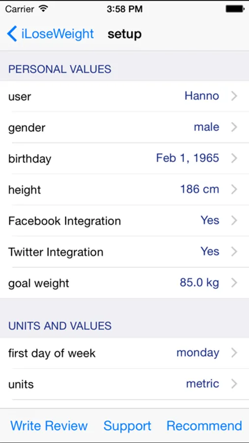 The iLoseWeight app also gives you user defined entries for adding your specific info for a totally customized experience. To help you view your progress quickly, it can show your stats in a graph. Also the calculated BMI and WHR values.