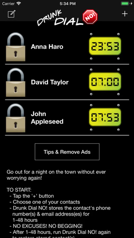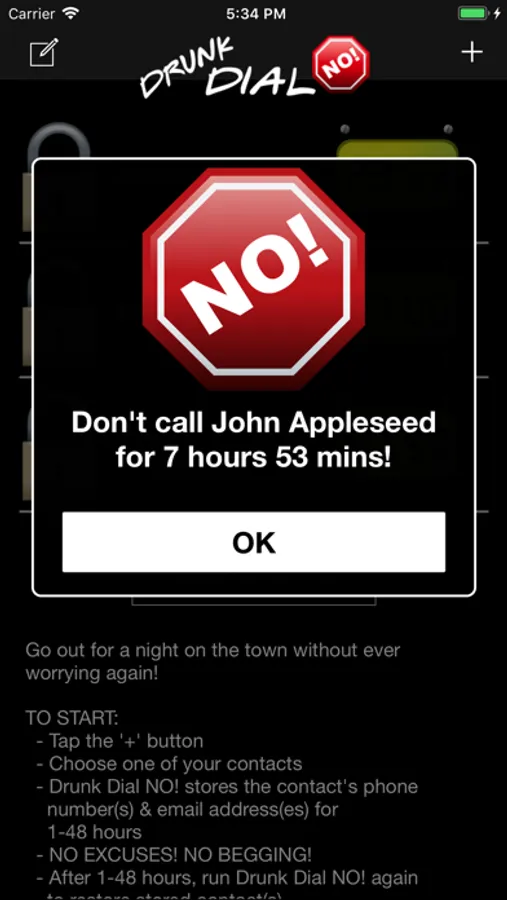 NEW FEATURE: Drunk Dial NO! now blocks incoming numbers for the time you set! Make sure that annoying ex-boyfriend doesn't try to call you when you're out on the town. Make sure your boss doesn't call and hear you drunk! Awesomely useful!