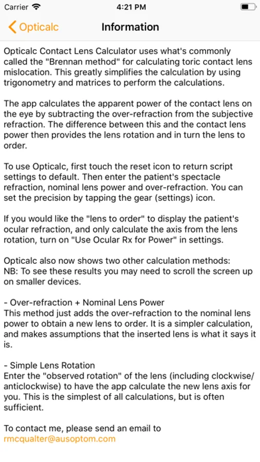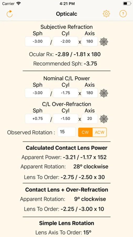 If you have a mislocating toric contact lens, Opticalc can tell you by how much the lens is mislocating, and suggest a new lens to order.