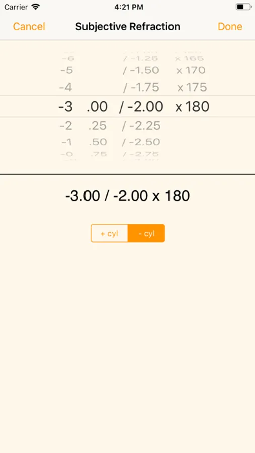 Features freeform script entry. For example, entering "50" will automatically convert to "+0.50", entering -650 will automatically convert to "-6.50". Cyl powers are assumed to be minus, for example, entering "75" into a cyl power will be converted to "-0.75".