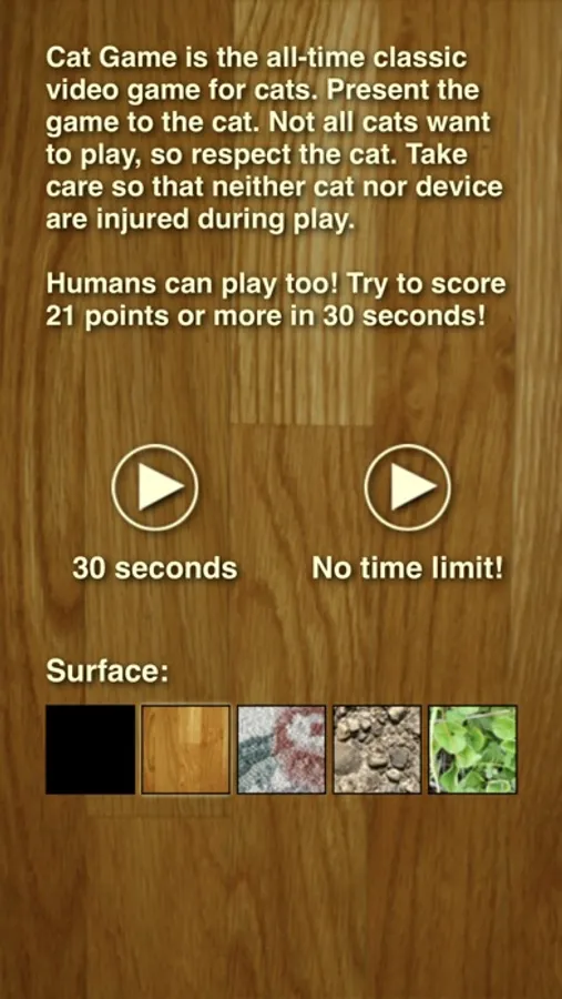 Cat Game is the classic video game for cats, based upon the "catch the laser dot" game that cats have enjoyed for ages. Present the game to the cat. Not all cats want to play, so respect the cat. Take care so that neither cat nor device are injured during play.