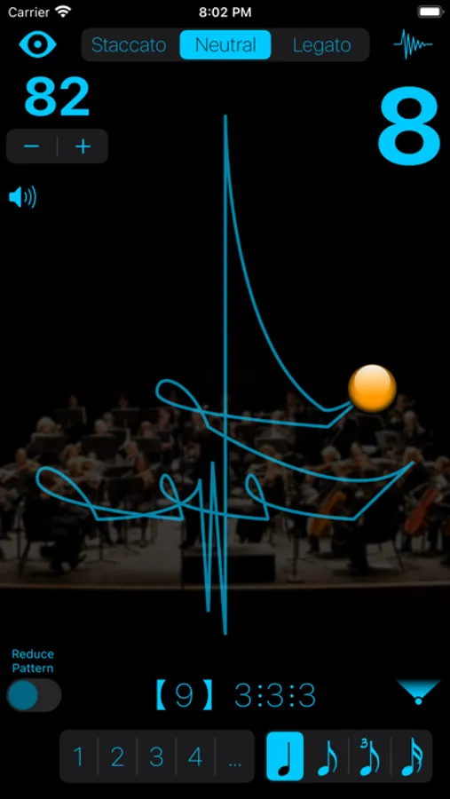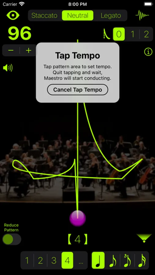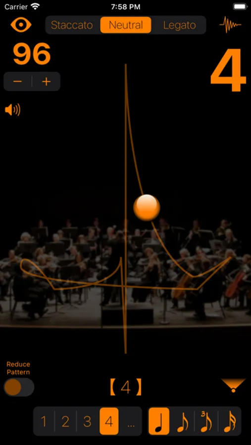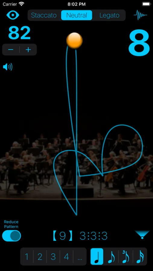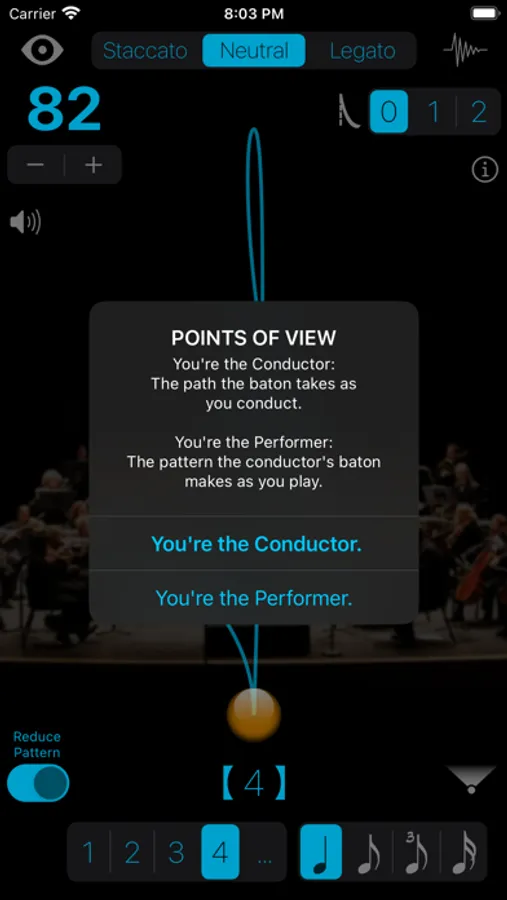 Conductor's Point of View - automatically flips the beat pattern for conductors to learn and practice the patterns. This mode shows you the path the tip of your baton should take while conducting.
