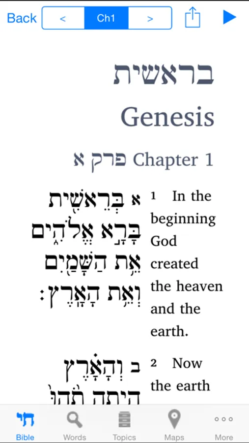 When reading a book or chapter (regardless of the version selected), it is also possible to listen to the Hebrew version of the selected book/chapter being read by pressing the "Play" button at the top of the page. The audio readings are pronounced in Sephardi-style Hebrew. In additon to a "Book"-based reading approach, it is possible to also toggle to a "Parashah"-based approach (a Parashah is the weekly synagogue Torah/Haftarah reading). Both Ashkenazi and Sephardi Parashah readings are supported. While reading the Hebrew and Hebrew/English versions, if you touch any Hebrew word, you will be presented with a pop-up English definition. From the popup, it is also possible to display a list of all the verses in the Hebrew Bible that contain that word.