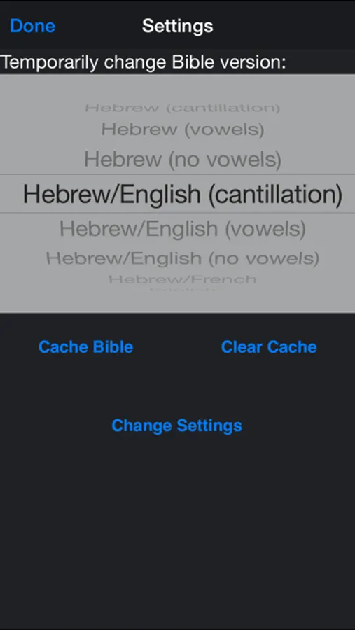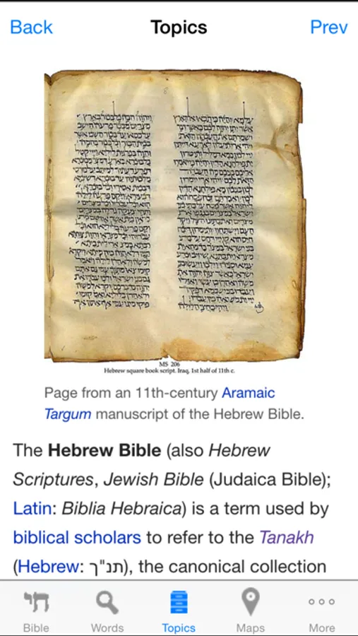 1. Bible: The Hebrew Bible is accessible in several different versions (a default version is selected via iPhone preferences and it is possible to change versions while running the application as well). The first six versions listed below are included in the App, the other versions can be either accessed over the Internet or downloaded (at no additional charge). The versions that are available are:
