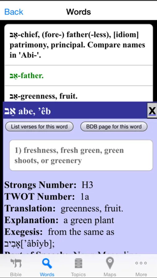 2. Words: This is useful for learning more about specific Hebrew words and for discovering related words. One can lookup words by "Root" by selecting the first two letters of the Hebrew word root. A listing will be displayed of all Hebrew words (and, optionally, Aramaic words and/or proper names) that begin with those two letters. Once the list is displayed, touching a word will open up a further level of detail about the selected word (and, optionally, all verses that contain that word or the BDB page for that word). Alternatively, one can use the "Translate" function to translate words or sentences or go directly to the word detail via the "Strongs" number lookup function. There is also a word search facility.