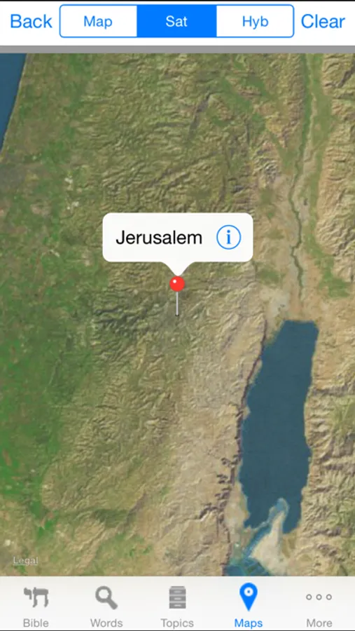 4. Maps: There are maps of almost every location (over 1,000 locations) mentioned in the Hebrew Bible. It is possible to display multiple different locations on a map and to clear previously selected locations from a map. One can access Maps by Bible book or a consolidated list of all maps. By selecting a location on the map and touching the "callout detail disclosure" symbol (the "right arrow"), one can see a listing of all verses in the Hebrew Bible that mention that location.