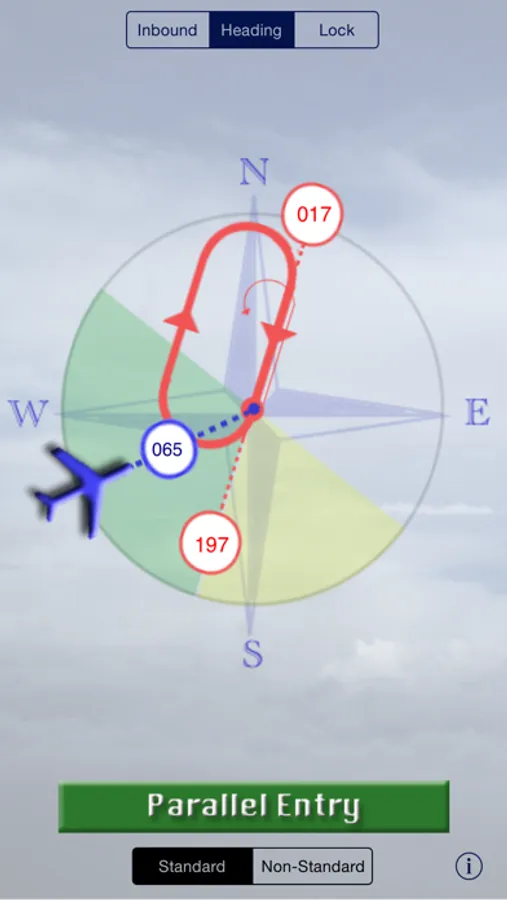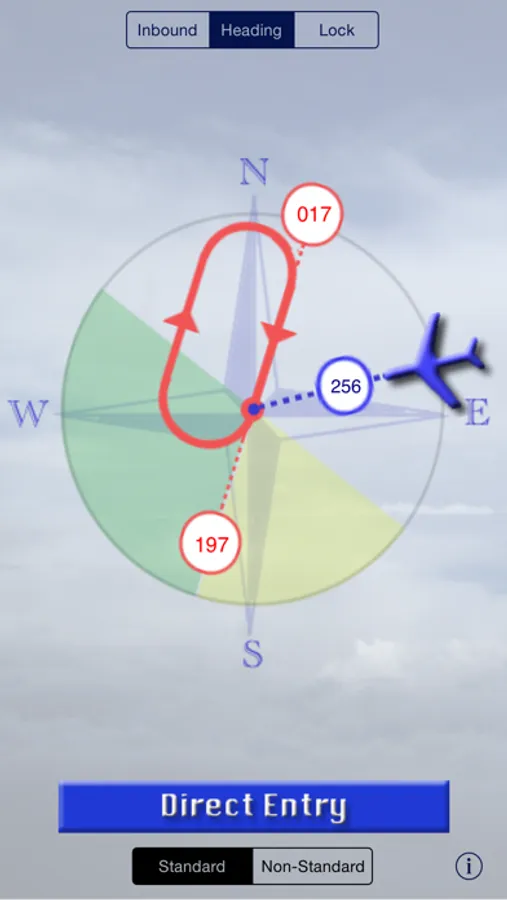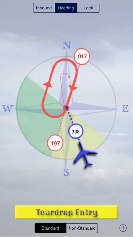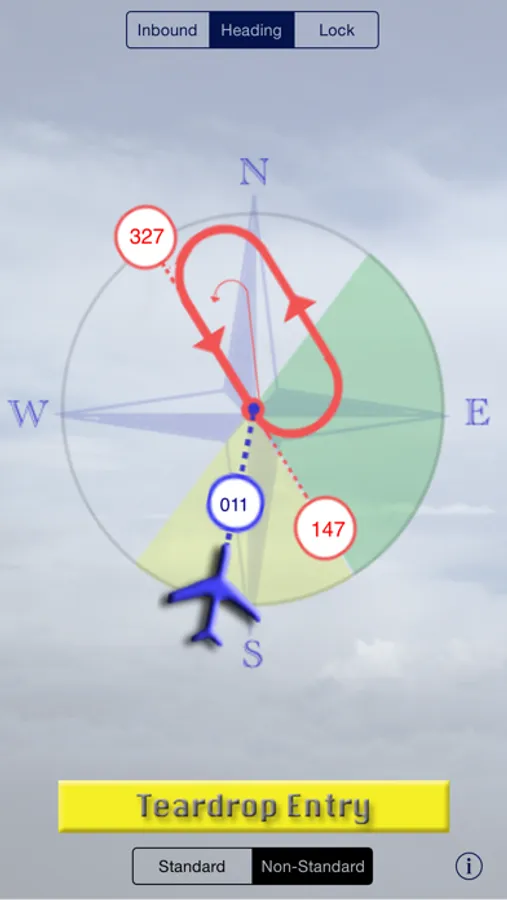 To use, simply touch the screen and rotate to set the holding pattern to the desired ATC assigned inbound leg. To aid in ease of use, both the track of the inbound and outbound legs are depicted. If the hold is non-standard (to the left) simply touch the "Non-Standard" switch to depict the correct pattern. Then select "Heading" and rotate the aircraft to the appropriate heading towards the fix. The image may also be locked to protect the settings from inadvertent touches by selecting the "Lock" button.