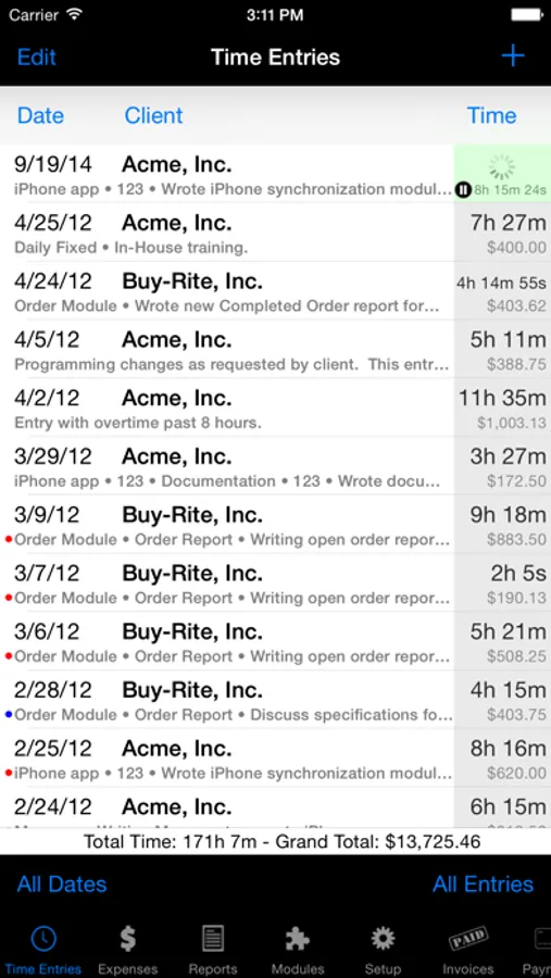 - Time Entries are by Client and can be sub-categorized by Project and Tasks