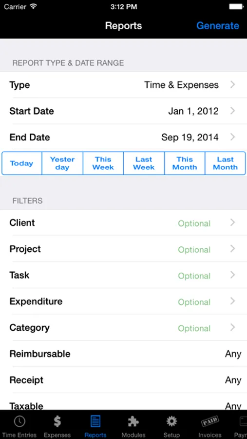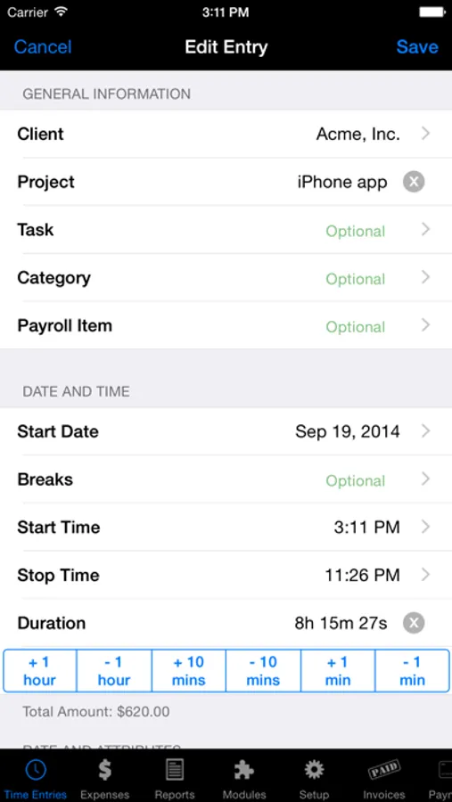 Adding new Clients, Projects, Tasks and Expenditures is super easy. You can create them on the fly without having to navigate to a separate maintenance screen. To edit them you can tap on Setup, do you edit and then return to where you left off in Time Entries or Expenses. By selecting a Project or Task first will automatically fill in the Client field for quick entry.