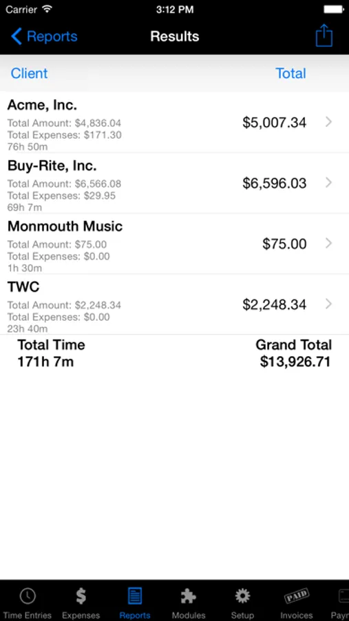 - Display Reports right on your device that you can view and export via email in HTML and/or CSV format. By Client or Timesheet