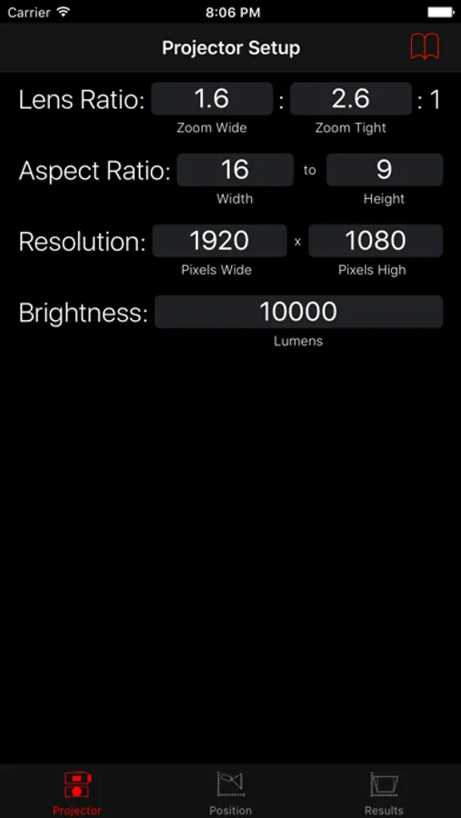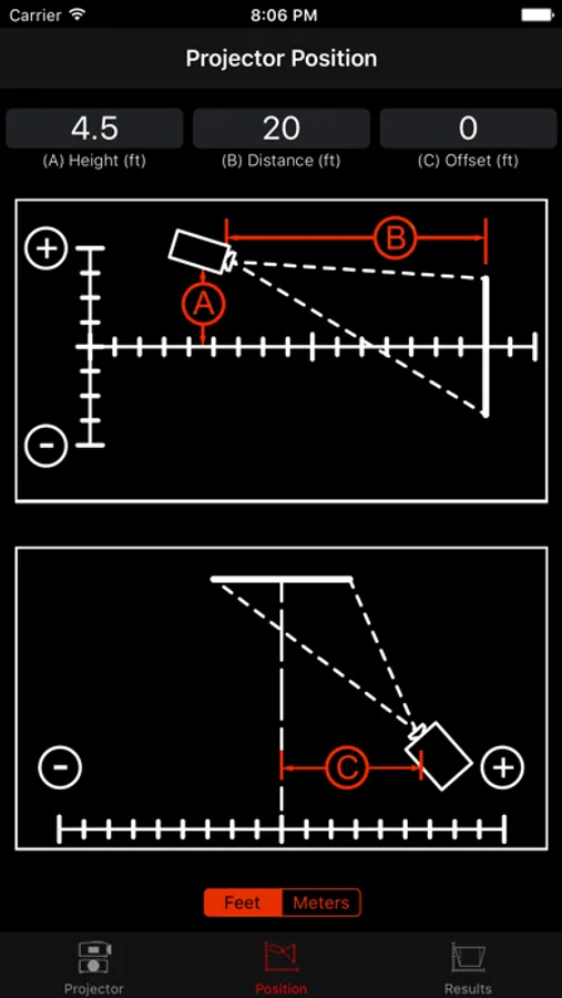 ProjectorCalc allows users to enter details for a projector and its location in relation to a projection surface.