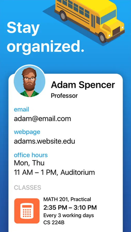 Not only you can enter most common course details, but also add instructors with all related information such as office hours, affiliation, phone number and email address. As well you are welcome to add holiday periods and even cancel separate classes in case of outstanding events.