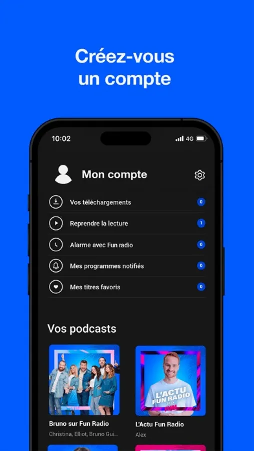 - Créez-vous un compte pour suivre vos émissions et podcasts favoris, télécharger des épisodes, reprendre votre émission là où vous l'avez laissée, choisir les notifications et newsletters que vous souhaitez recevoir et programmer votre alarme personnalisée Fun Radio.