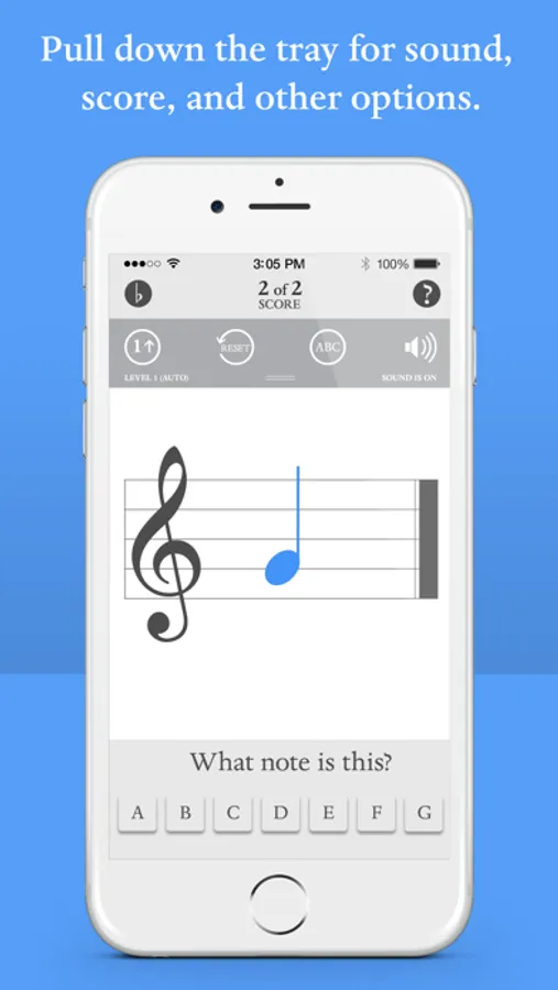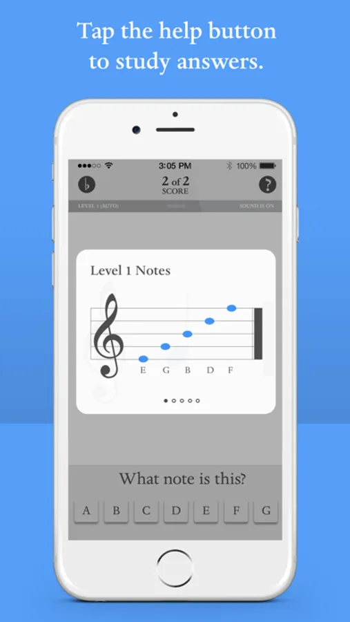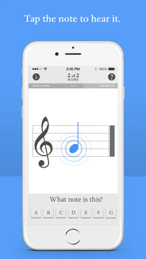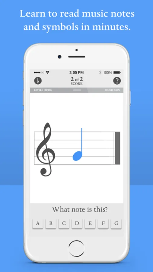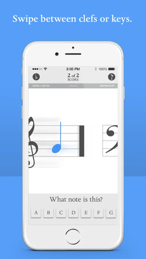 Get Started! Choose desired musical clef: treble or bass. You can easily switch from treble to bass or bass to treble with one simple swipe! Identify the correct note by touching A B C D E F G button and advance to the next note. Already know the note? No problem! Double tap on note to skip to the next note. Master level 1 and proceed to the next level until all 4 levels have been mastered. Each correct note scores a point. Blue Note also recognizes missed or incorrect notes and will repeat these notes until they have been mastered. Users can manually change levels, with a touch of the screen, and save score and level upon exit as well!