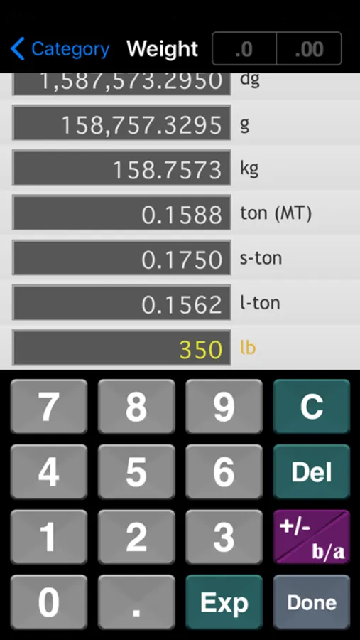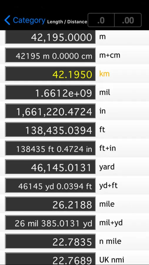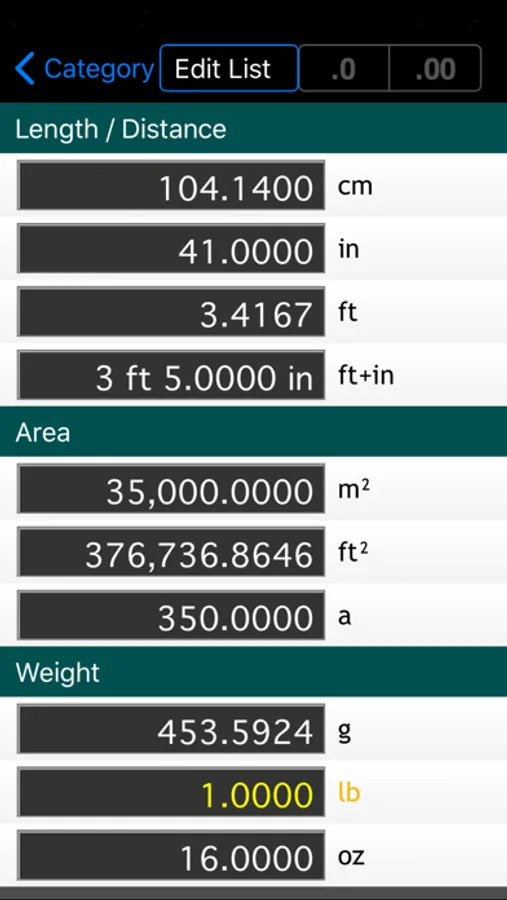 Only two taps to get a required unit conversion table! (1) Tap desired unit category in category list and (2) tap value field of any unit you want to convert from. Immediately, converted values are displayed for all the other units based on "1.0" of the unit you tapped.
